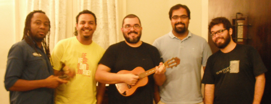 Essa é a nova formação da banda. Da esquerda para a direita, temos: Cadu (percussão), Josué Ribeiro (teclado), eu (voz e violão), Sandro (baixo) e Léo (guitarra / violão / voz).
