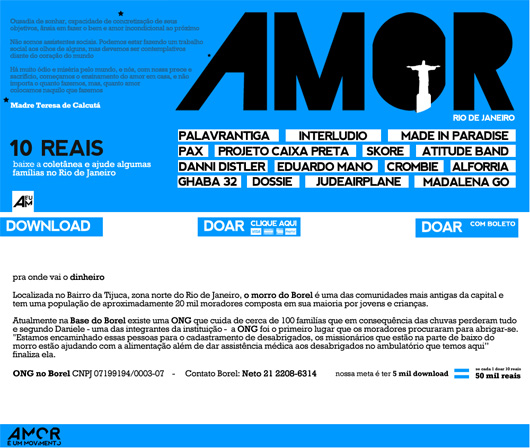 Ontem entrou no ar o site para download da coletânea do Amor é um Movimento. As bandas você pode conferir aí no fabuloso print-screen. O download tá lá, é só baixar o arquivo. Mas há a opção de abrir o bolso: através do paypal ou de boleto bancário. O valor sugerido é de 10 reais, mas você sabe: pode ser mais.