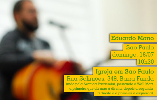 No próximo domingo pela manhã eu vou tocar umas músicas na Igreja em São Paulo, em (óbvio) São Paulo. Eu e Eline vamos à cidade resolver algumas questões e de lambuja veio o convite pro culto. Infelizmente não vamos com a banda, o que tornaria tudo melhor e mais imperdível do que já é. 😉