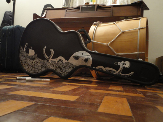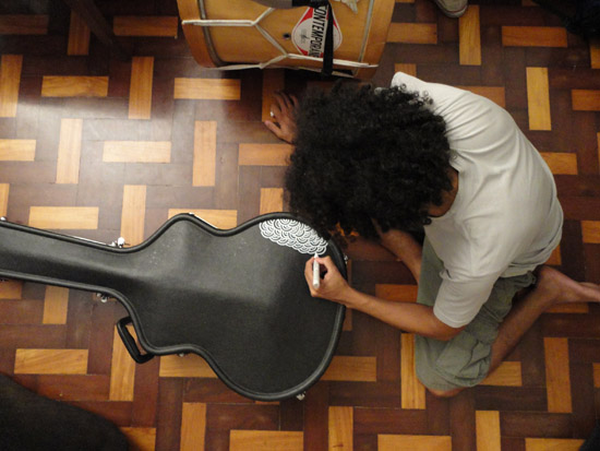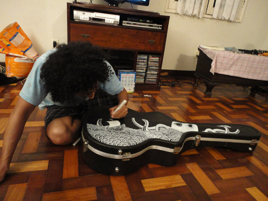 O Fá (apelido do Josafá) ficou conosco durante os sete dias de gravação na casa, e resolvi fazer outra encomenda a ele: um desenho no case do meu violão. Sem mais, delongas…