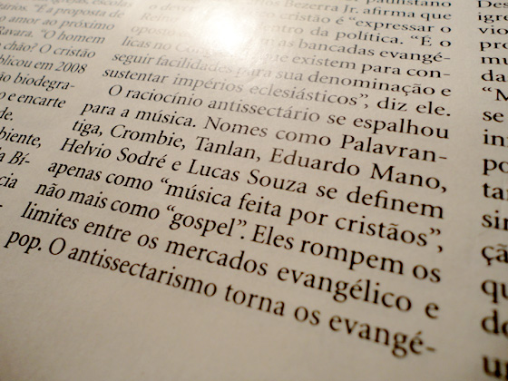 A matéria, cujo título interno é bem melhor, foi (muito bem) escrita por um cara chamado Ricardo Alexandre que, ao que tudo indica, é evangélico também (coisa que notei ao ler o texto e, inclusive comentei com a Eline – isso não tira em nada do mérito do cara, já que o texto é realmente bom). Quer dar uma lida? clique aqui. Até aí, uma boa novidade: uma matéria na mídia que não fala mal dos evangélicos! Mas tinha mais uma notícia.
