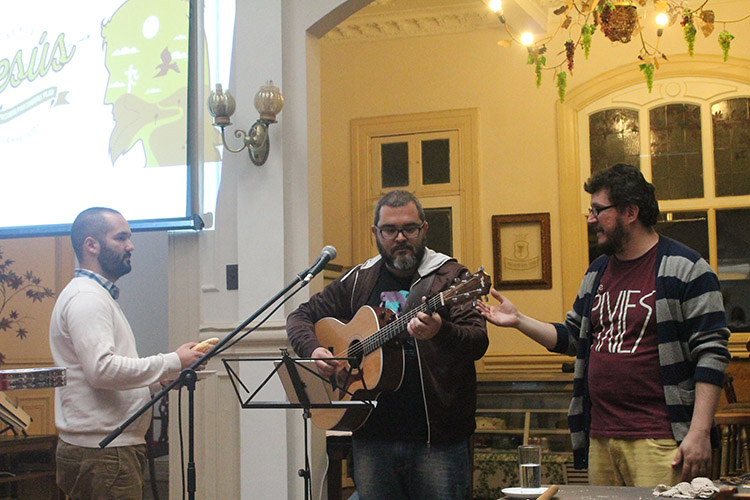 A música é uma parte importante da vida da Iglesia Uno, e o responsável por ela é Javier Contesse, novo amigo que fizemos e que, além de compositor de mão cheia (assim como o Pr. Jonathan, e logo falaremos mais disso) dirige as bandas de ambos os locais de culto. Ele e sua esposa, junto a sua linda filhinha, estão de mudança para os Estados Unidos, onde ele estudará Adoração e Teologia pelos próximos 3 anos (inclua-os em suas orações, por favor 🙂 ). Para saber um pouco mais sobre a música reformada no Chile, acesse sua página no Facebook: Canción Reformada.